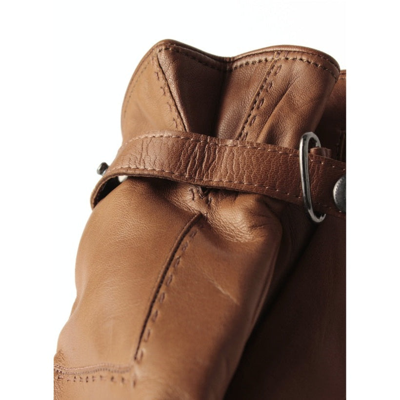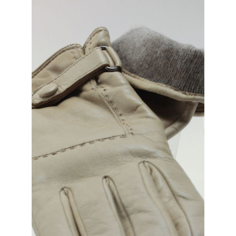 Des gants en cuir pour femme doublés de pur cachemire, ornés d’un soufflet sur le dessus de la main et d’un élégant bracelet avec bouton recouvert de cuir.