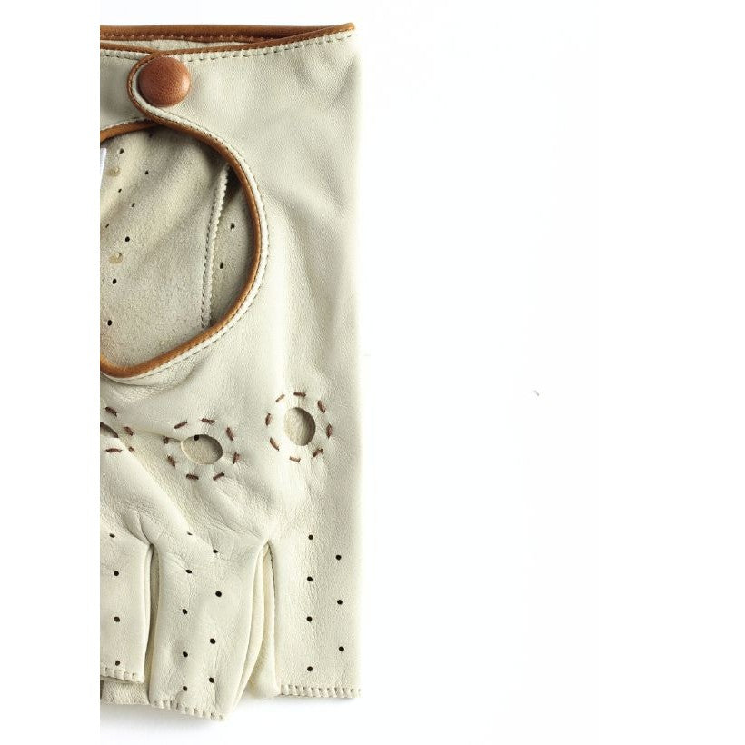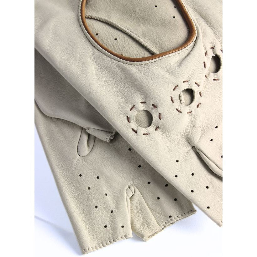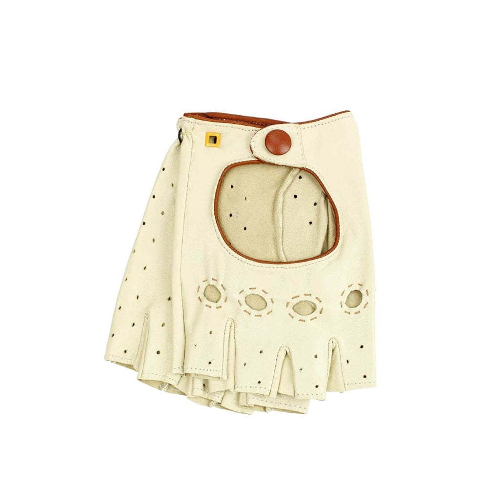 Un gant à demi-doigts en cuir beige et cuir naturel, fait pour ceux qui veulent allier style, confort et contrôle.