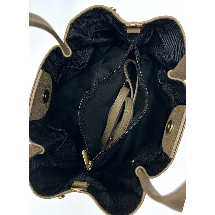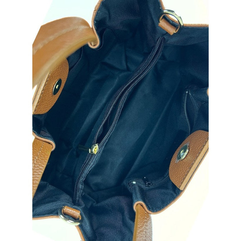 - Les tons naturels cognac et taupe la rendent facile à assortir et intemporelle.
