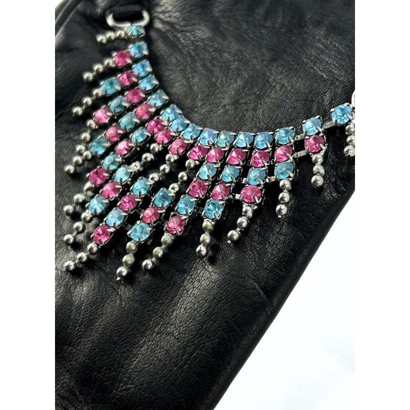 Confectionné en cuir italien de très haute qualité, il est sublimé par un détail bijou raffiné qui le rend immédiatement reconnaissable. Le bord supérieur est orné d’un tressage élégant en ruban de cuir argenté, pour une finition sophistiquée. À l’intérieur, une doublure 100 % soie enveloppe la main avec légèreté et douceur, pour un confort inégalé et un toucher luxueux.